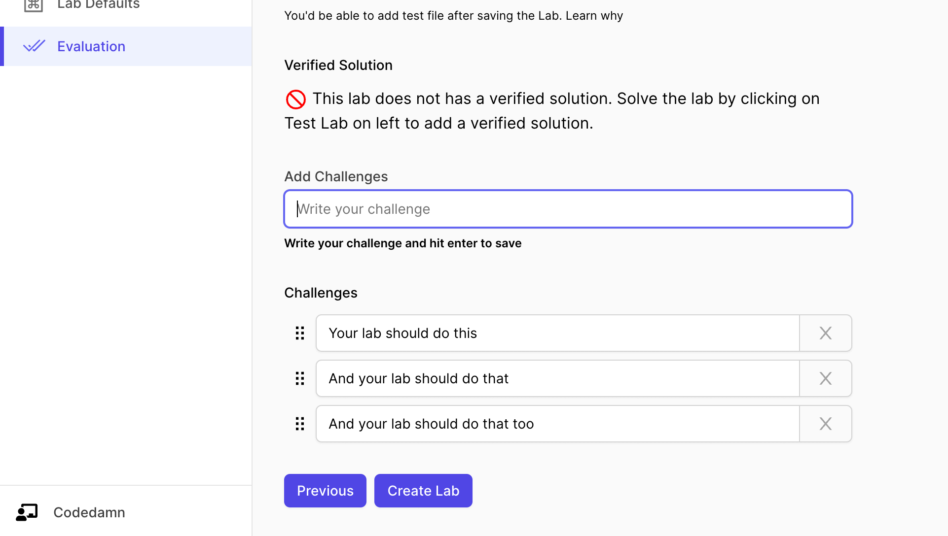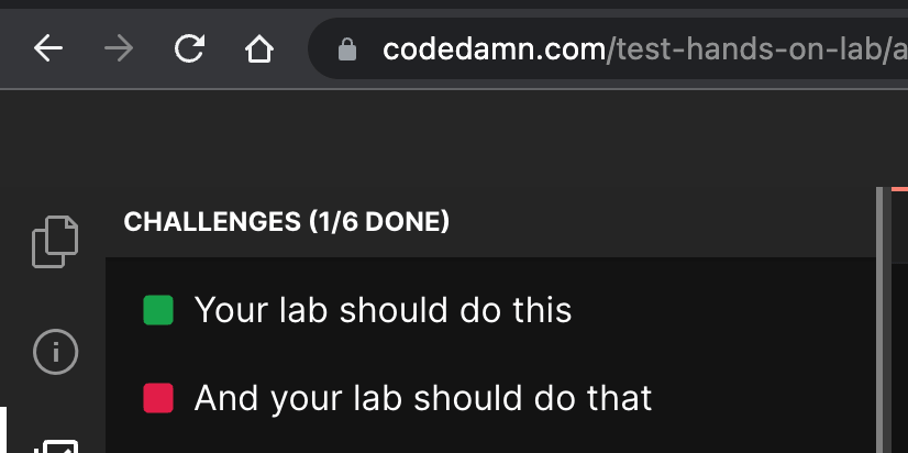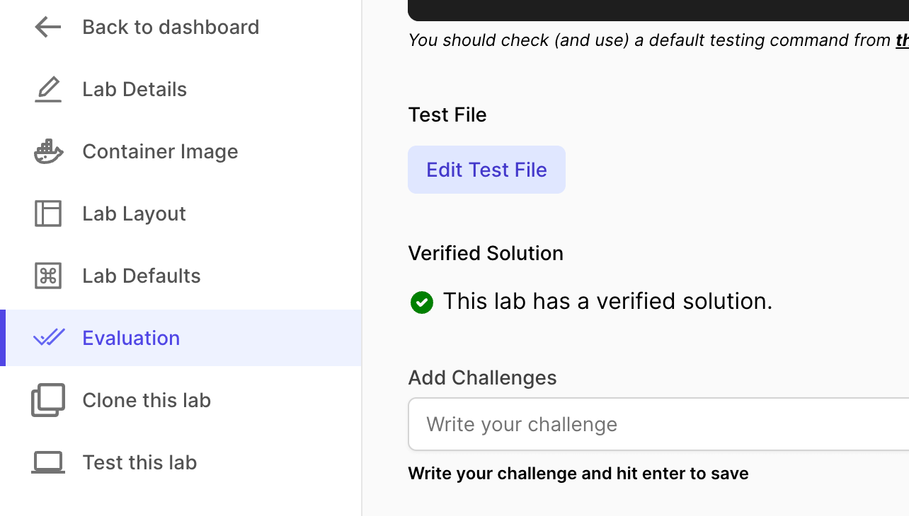 Next step is to setup challenges and evaluation for your lab. This is the part where your learners can learn the most because they will have to pass certain challenges.