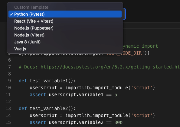 Note: For Python labs, I'm assuming you will be using the pre-installed pytest utility to test the user code. Hence, we use the pytest testing format here: