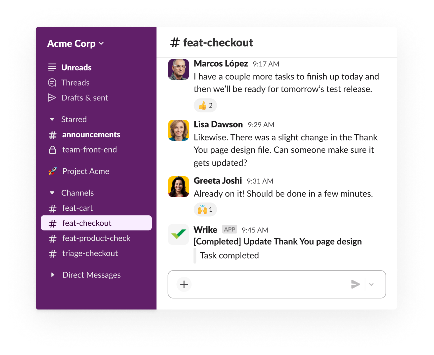 You can use Slack for all your task management needs. From task reminders to specific channels for project updates to seamless team collaboration, Slack helps you never miss a task or deadline. Go further by integrating with thousands of tools such as Asana, Wrike, Monday.com and many more to manage every task in Slack, your productivity platform.