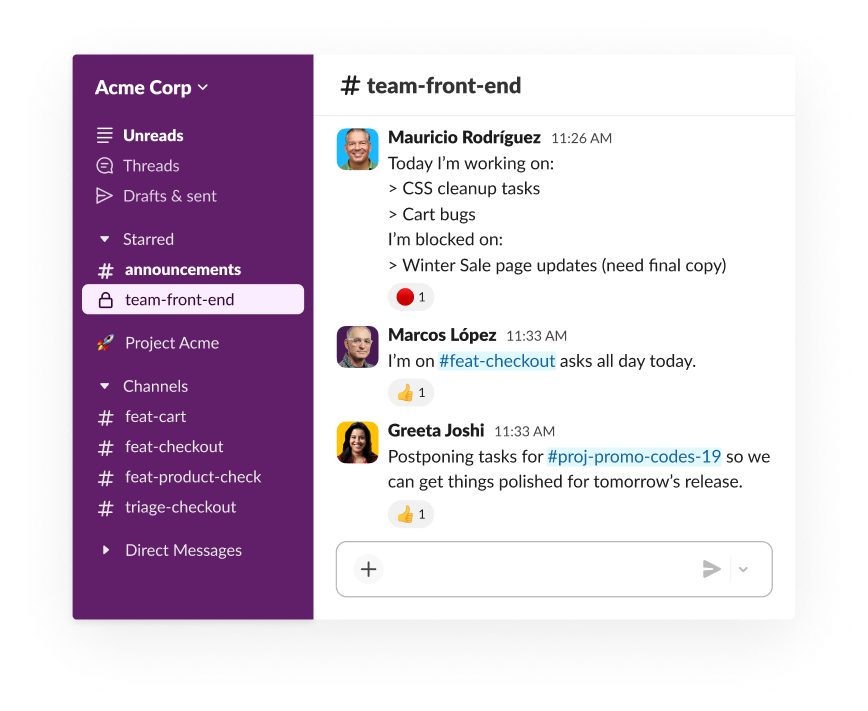 Work in Slack happens in collaborative spaces called channels. Conversations and files related to your tasks stay organized in the appropriate channel for that project or initiative, allowing you to focus on specific tasks and manage your time as needed.