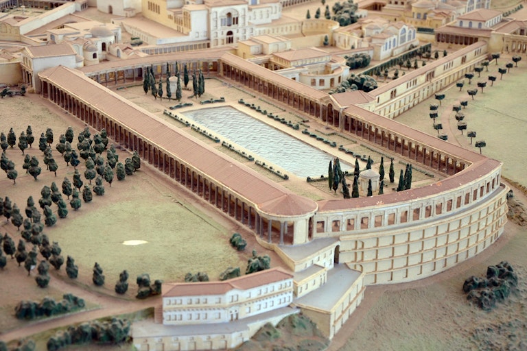 In Hadrian’s Villa in Tivoli, Italy, a similar inscription was found in the Poikilé, the large four-sided portico enclosing a garden with a central pool. The north side of the Poikilé was a double portico, with circular spaces at both ends to allow one to do laps: this was where the emperor could walk sheltered from the elements. Thus, Hadrian could either take exercise in the open air, in the central garden, or under the roof of the double portico.