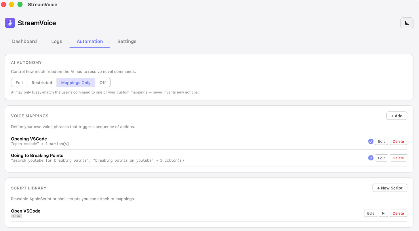 • A Stream Deck with infinite buttons — Define as many voice mappings as you want in the Automation tab. Each one binds one or more trigger phrases to a chain of actions: keyboard shortcuts, AppleScript, shell commands, opening URLs, or scripts from the reusable Script Library.