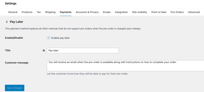 The Pay Later gateway can be configured by going to WooCommerce > Settings > Payments > Pay Later, where it can be enabled/disabled, and the displayed Title and Description can be customized.
