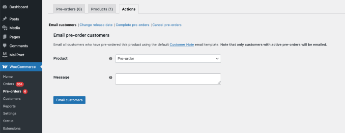 Allows you to send a custom email to a group of pre-order customers based on their product. This will not change the pre-order status.