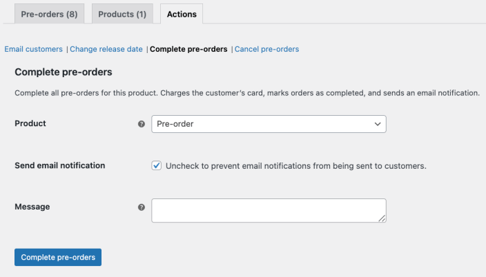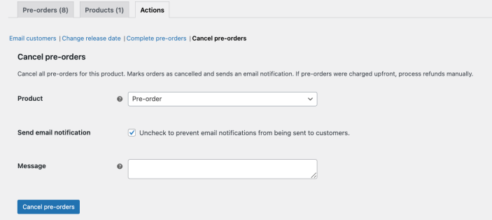 These actions allow you to select a pre-order product and perform an action upon all pre-orders for a given product, optionally send an email notification to the affected customers, and supply an optional customer message. The following actions are supported: