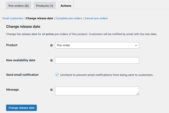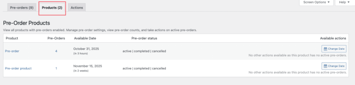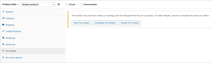 As long as there are Active pre-orders for a product, the fee and “when to charge” settings can not be changed, while the release date may be changed via the WooCommerce > Pre-Orders > Actions tab or WooCommerce > Pre-Orders > Products tab, described later in this document. To update the pre-order configuration, active pre-orders must either be cancelled or completed.