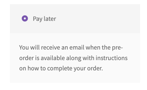 ↑ Back to topThe Pre-Orders plugin includes a “Pay Later” gateway, which is used to provide support for any and all payment gateways for pre-order products that are paid for “upon release.” The Pay Later gateway will only be displayed as an option during checkout if there is a pre-order in the cart and the pre-order amount is charged “upon release,” alongside any available supported gateways: