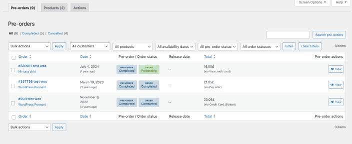 Pre-orders and pre-order statuses may be viewed, managed, and administered in WooCommerce > Pre-orders: