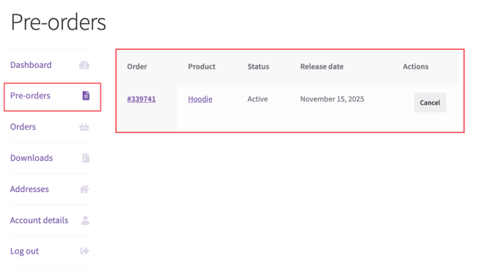 ↑ Back to topCustomers can view past and current pre-orders by visiting the Pre-Orders tab on their My Account page:
