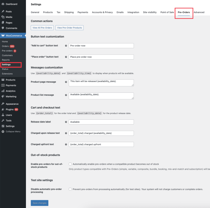 {availability_date}and{order_total}. - Enable pre-orders for out-of-stock products: this option allows pre-orders when a compatible product goes out of stock. Compatible product types include simple, variable, Composite Products, Product Bundles, WooCommerce Bookings products, Mix and Match Products, and WooCommerce Subscriptions products. For variable products, all variations must be out of stock.