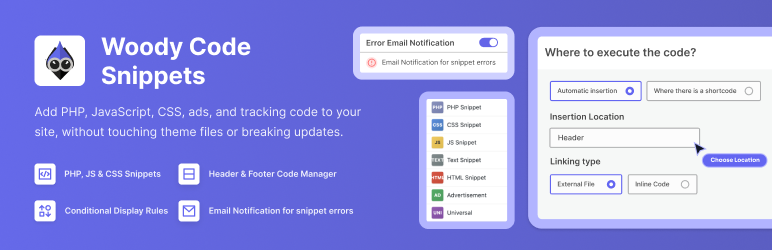 Woody Code Snippets is a WordPress plugin that helps you insert code into your site without editing theme files.