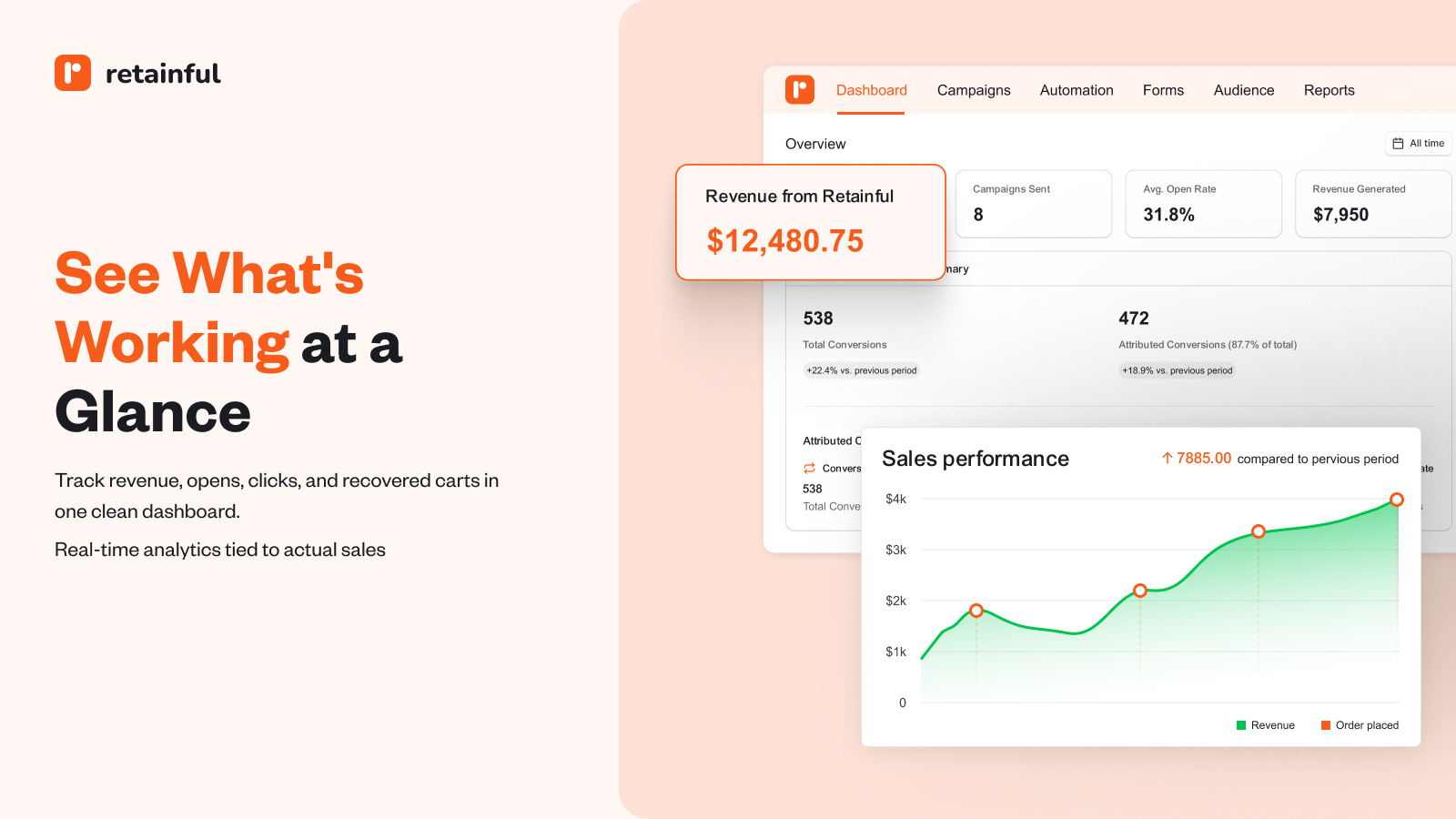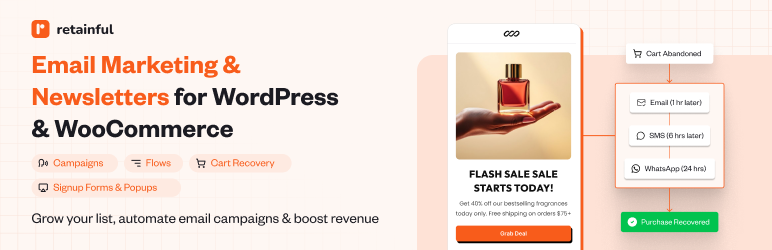 Retainful is a powerful email marketing tool for WooCommerce and WordPress that gives you everything to grow revenue —without the complexity or enterprise pricing. Build your list, recover abandoned carts, automate customer journeys, and send beautiful email campaigns, capture email addresses with signup forms & exit intent popups, and more.