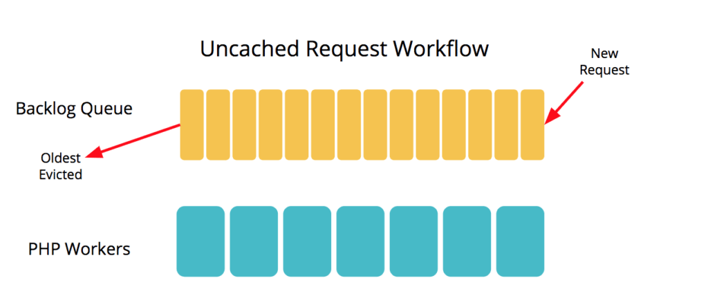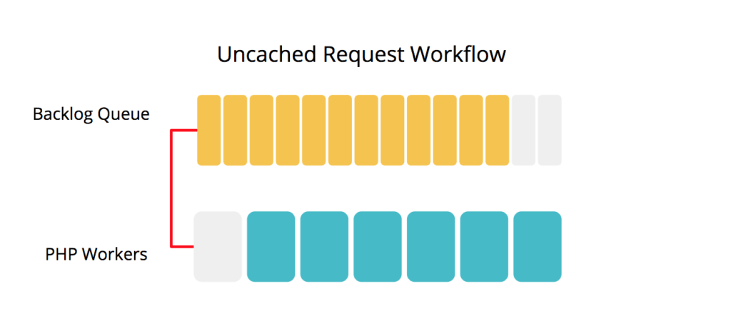 When all PHP workers are busy, a backlog queue of requests builds up. The backlog feeds the longest-waiting queued request to the next available PHP worker. Having this backlog means additional uncached page requests can come in and still be served, even when all workers are already busy.