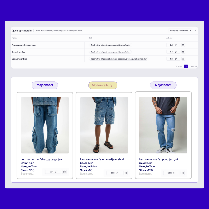 Low-code widget deployment and intuitive merchandising rules let business teams boost/bury products, spotlight campaigns, and adjust rankings in real time – without waiting on developers.