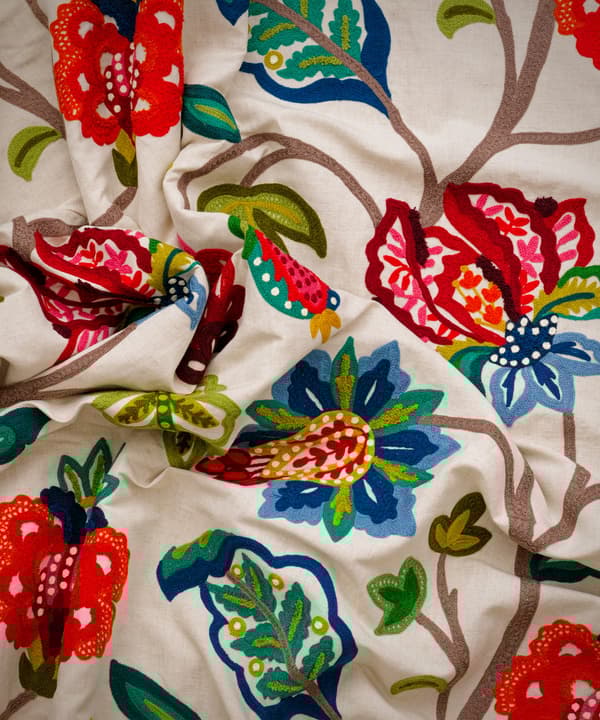 The Great Hall collection interprets this rich history with a range of classic and contemporary designs in a mix of bold, playful, and muted colours. A perfect example of beautiful hand guided embroidery, crewel work craftsmanship and chain stitch on linen grounds.