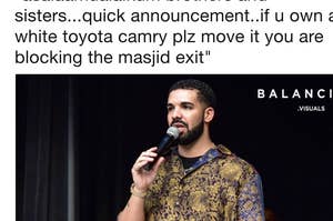 "Brothers and sisters, quick announcement — If you own a white Toyota Camry, can you please move it? You're blocking the mosque exit."