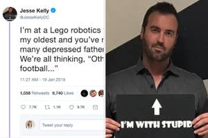 "I’m at a Lego robotics tournament for my oldest and you’ve never seen this many depressed fathers in one place. We’re all thinking, 'Other kids play football,'" conservative commentator Jesse Kelly wrote in a troll that still got a lot of people upset.