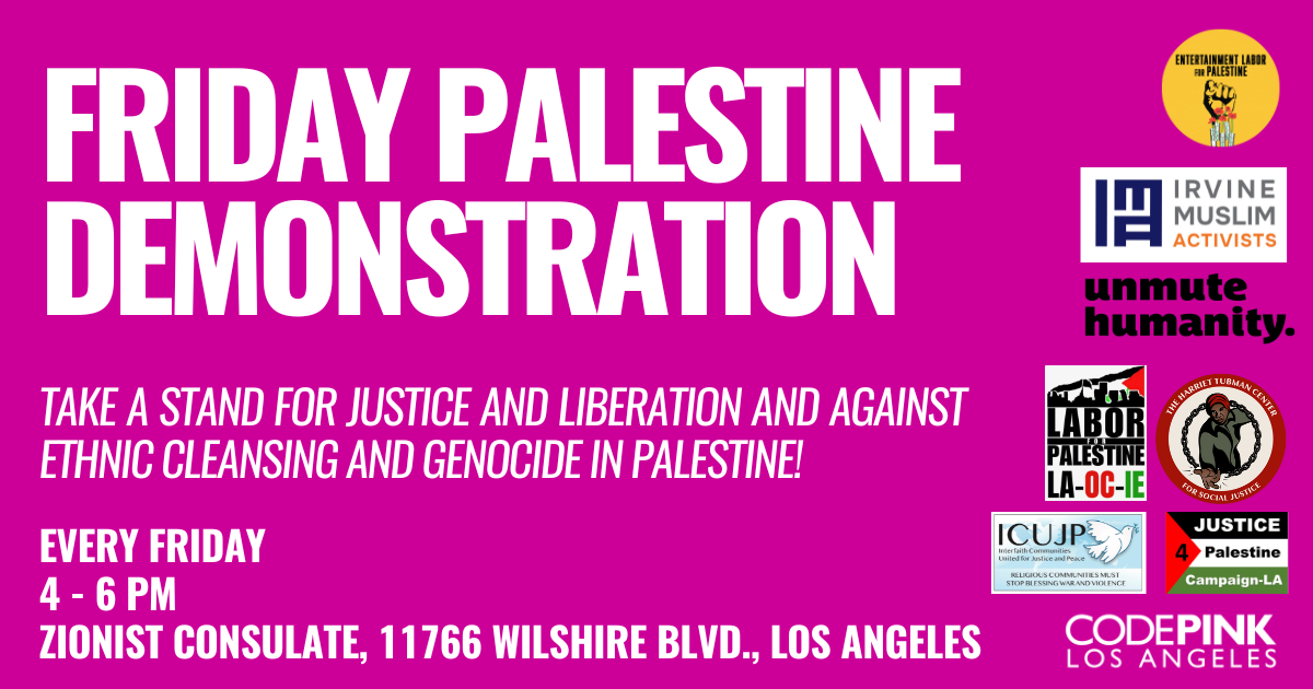 Join CODEPINK LA, Interfaith Communities United for Justice and Peace, Entertainment Labor for Palestine, Unmute Humanity, the Harriet Tubman Center for Social Justice, Labor for Palestine LA-OC-IE, Irvine Muslim Activists, Justice4Palestine-LA, and community members for a demonstration for Palestine every Friday from 4-6pm outside of the zionist consulate!