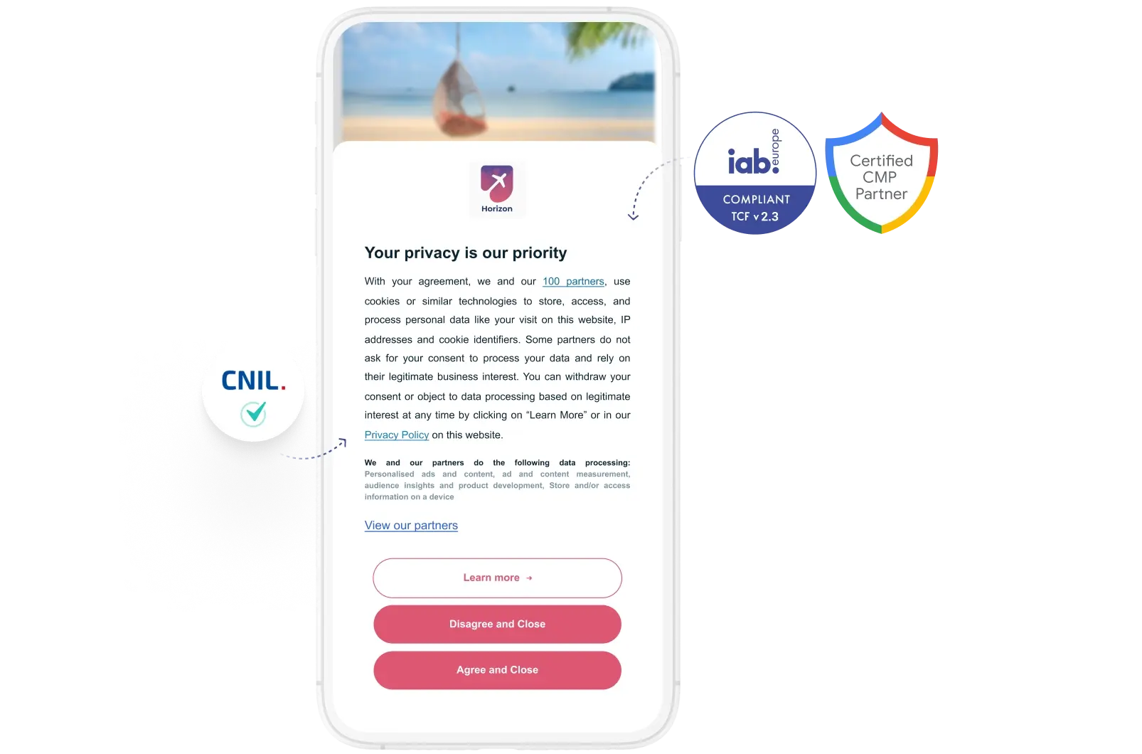 Our platform also integrates with frameworks like IAB Europe's Transparency and Consent Framework (TCF) and Google Consent Mode.