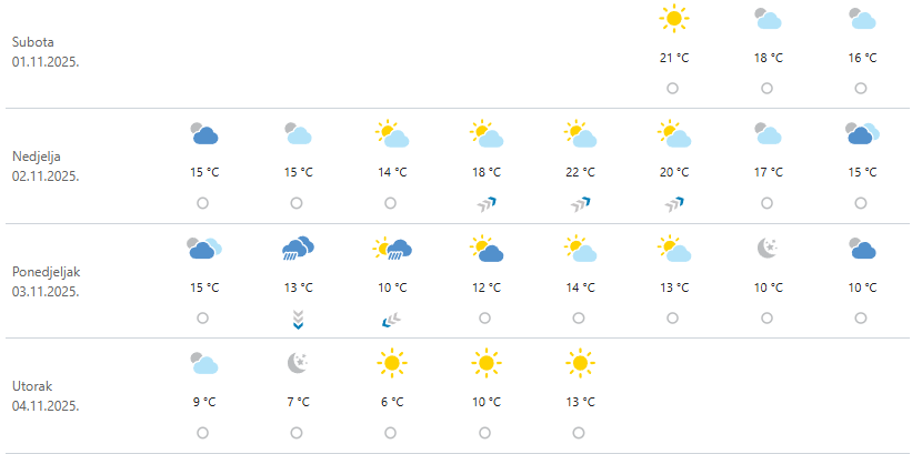 Nakon nestabilnog početka tjedna, u utorak se očekuje stabilnije i sunčanije vrijeme. Nebo će biti uglavnom vedro, uz tek poneki oblak. Jutro će biti svježije s temperaturama oko 6 do 9 °C, dok će se dnevne vrijednosti kretati do ugodnih 13 °C. Uz slab vjetar i više sunca, dan će biti pogodan za boravak na otvorenom.