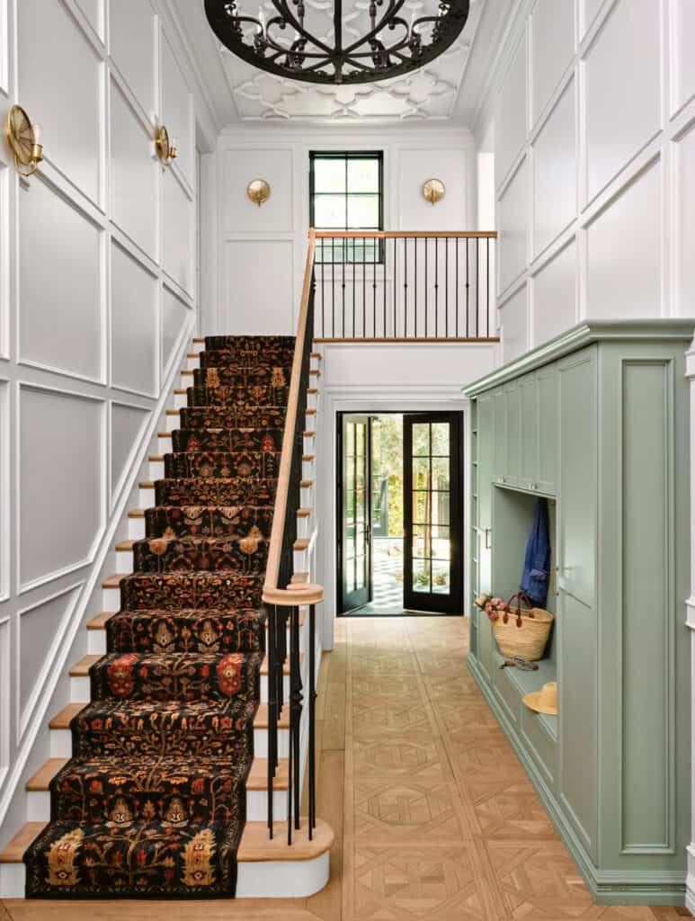 To give visitors a grand first impression, the couple turned the single-height entryway with a curved staircase into a double-height one with a traditional stair, featuring an iron handrail and Moroccan-style runner. They added custom millwork and a vintage chandelier to reflect the period in which the home was built.