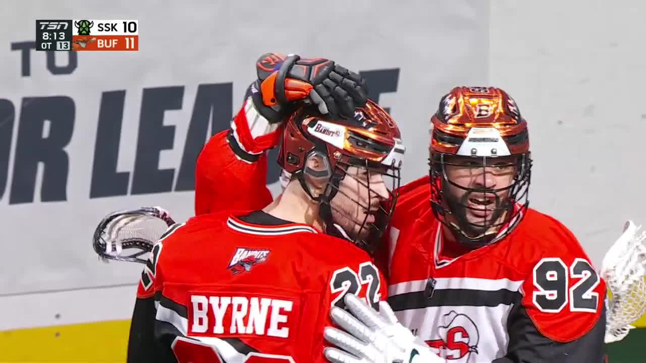 Josh Byrne scored 6:47 into overtime to give the Buffalo Bandits a dramatic 11-10 victory over the Saskatchewan Rush, snapping the visitors' franchise-best nine-game winning streak Friday.