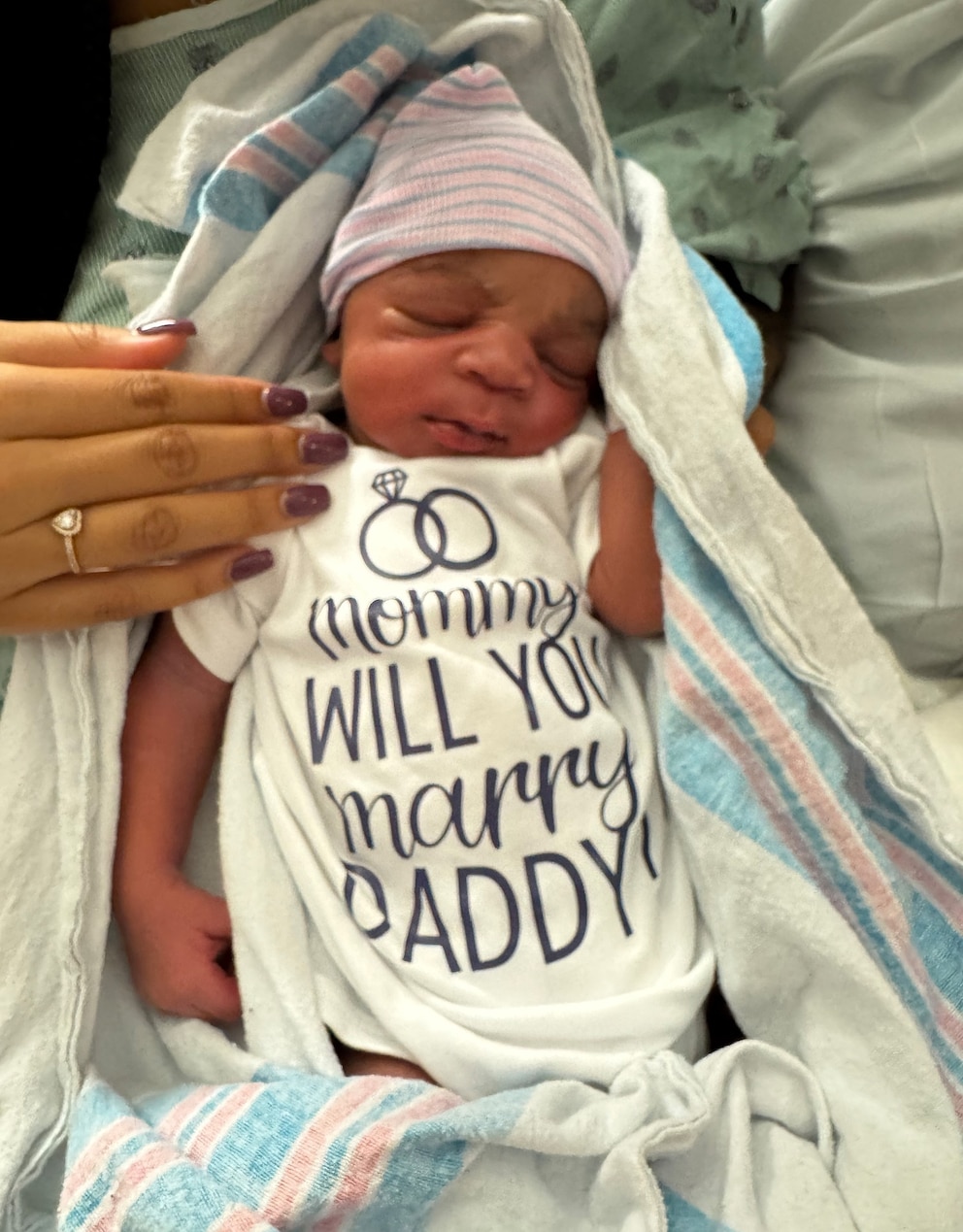 Printed on Ace's onesie is the question, "Mommy, will you marry Daddy?"