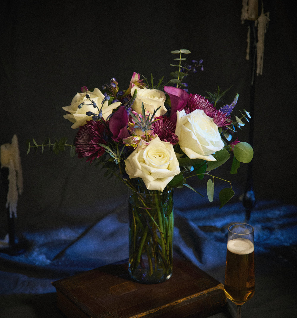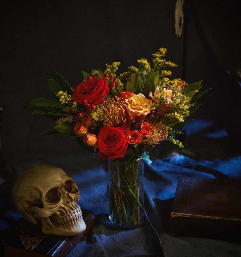 Another flower company offering beautiful bundles of dark florals is The Bouqs, with arrangements like the orange and black Jack-o-Lantern or glow-in-the-dark roses ready to enchant your Halloween tablescape.