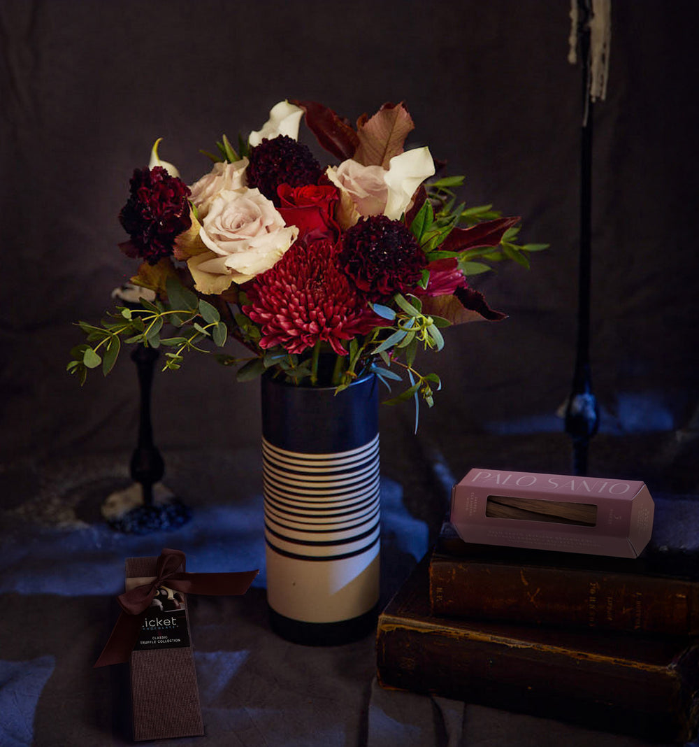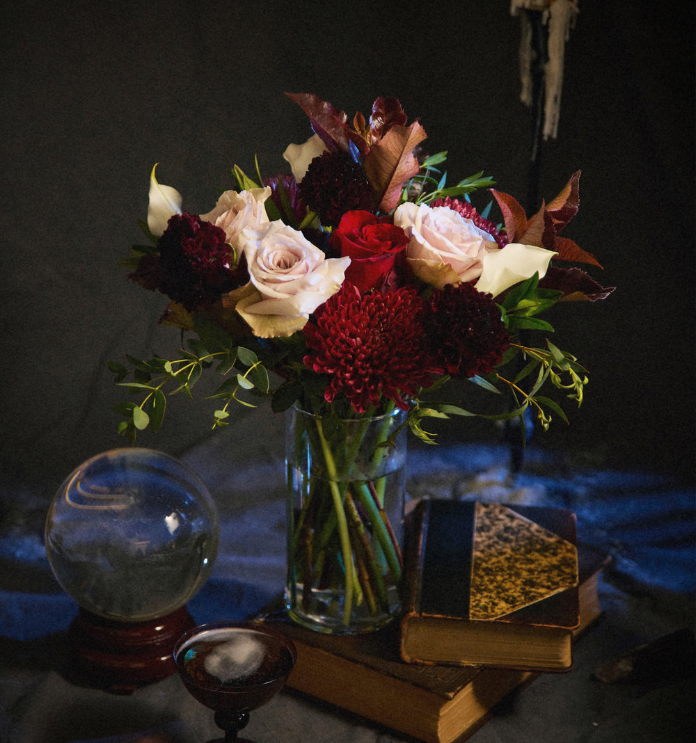 One exciting recent launch comes from flower delivery service UrbanStems. Select dark, fall-themed bouquets such as The Restoration (a bundle of roses, mini callas, cremon, button pom, alstroemeria and more) or The Revolution (composed of mums, roses, greenery and more) each come fresh and ready to add eerie elegance to your Halloween table, and those with witchy tendencies will adore the custom tarot card designed by botanical tarot artist and author Nicole Rallis.
