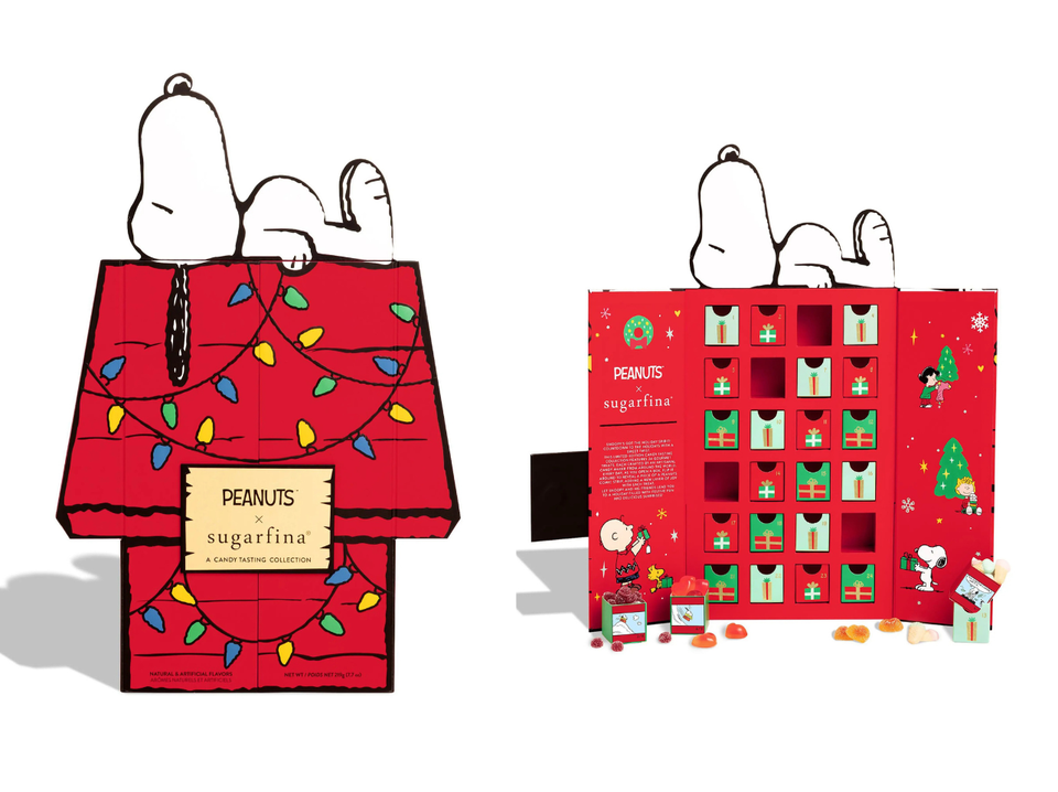 A fun Sugarfina candy calendar shaped like Snoopy's house