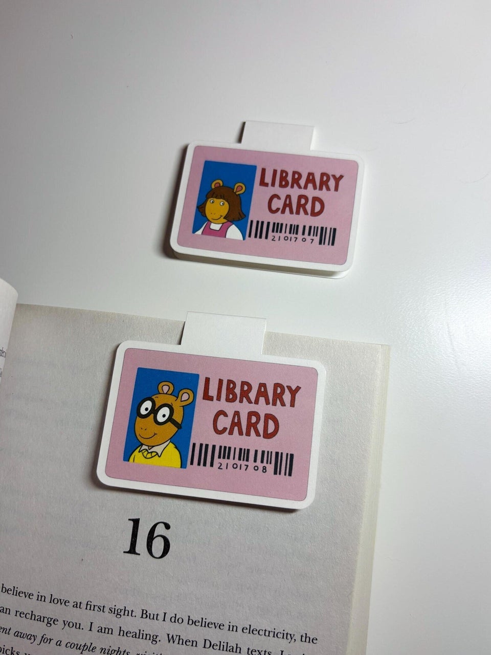 An Arthur or DW library card magnetic bookmark that'll hold their spot for them