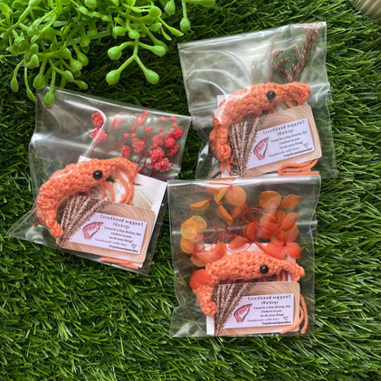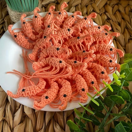 An emotional support crochet shrimp tiny enough to tote around with 'em wherever