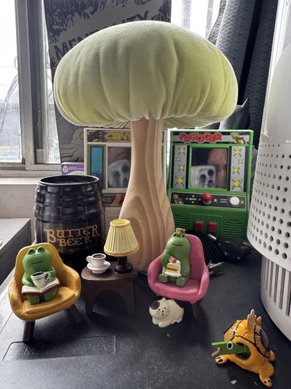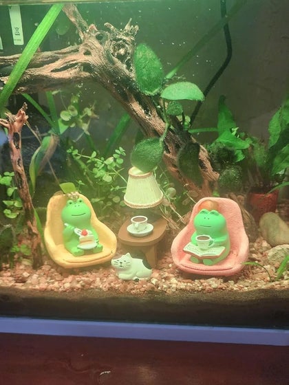 The set comes with two chairs, two frogs, a side table, and a cat.