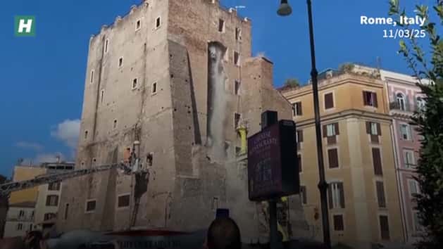 Hundreds of tourists had gathered to watch as firefighters used a mobile ladder to bring a stretcher to the upper level of the Torre dei Conti during the first rescue attempt. Suddenly, another part of the structure crumbled, sending up a cloud of debris and forcing firefighters to quickly descend.