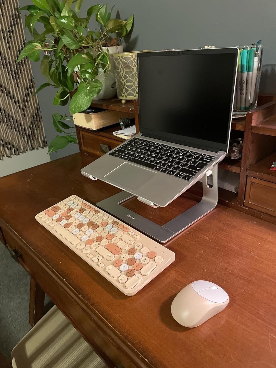 Promising review: "This aluminum laptop stand exceeded my expectations. It’s incredibly sturdy, with a sleek, modern design that looks great on any desk. The ergonomic height and angle make a big difference for comfort during long hours of work, reducing neck and back strain. I love that it’s detachable — it makes it easy to pack and take on the go. It keeps my laptop cool with great ventilation and stays firmly in place without wobbling. A simple, high-quality solution that’s worth every penny!" — TB
