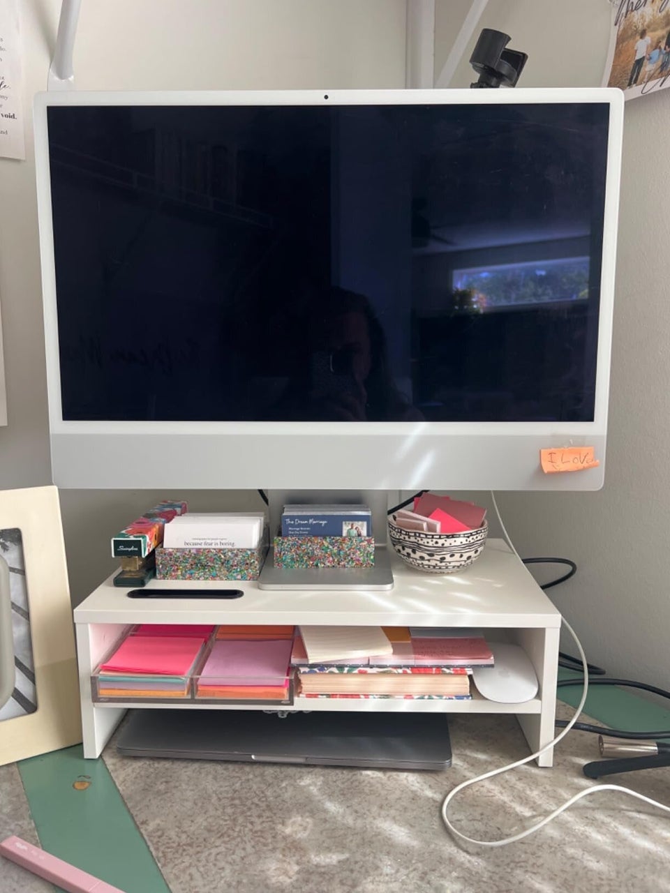 Promising review: "This monitor stand is exactly what I needed! The two-tier design gives me extra space underneath for storing notebooks, pens, and even my keyboard. It looks clean and modern on my desk, and I love the built-in phone holder and cable slots to keep everything organized. Super sturdy and functional — highly recommend!" — SH