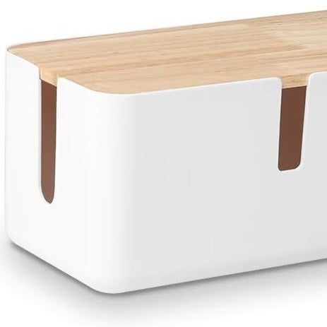 Promising review: "I bought this cable management box to organize the power strips and cords under my desk. It was easy to set up and fit all the cables inside. The wood lid looks nice and blends well with my furniture. The box is sturdy and has enough ventilation holes to prevent overheating. It also has rubber feet to prevent sliding. I am very happy with this purchase and would recommend it to anyone who wants to hide their messy cords." — JL