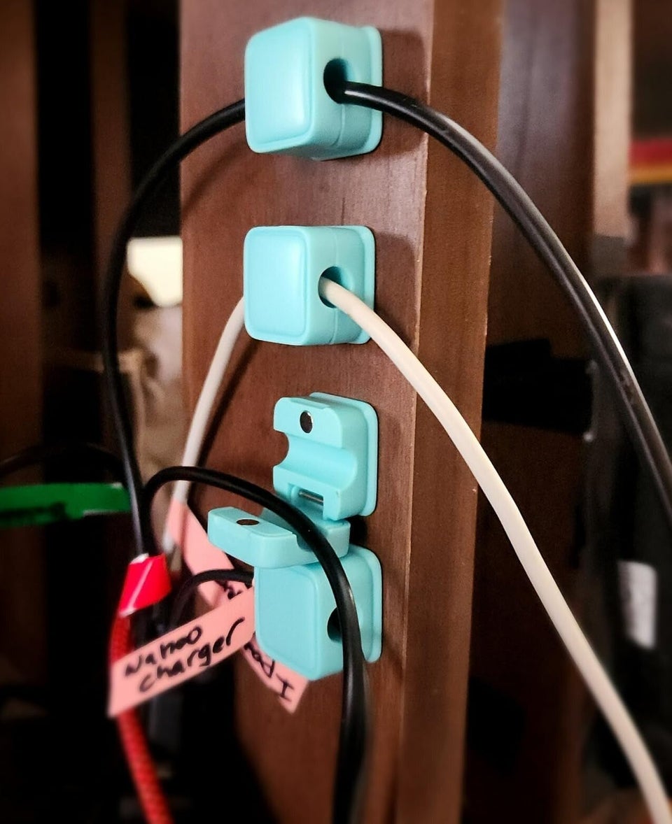 Promising review: "Absolutely amazing! I think this is the one item everyone needs in their homes. I stick them behind the nightstands and my desk to keep all the wires hidden, and the wires don't fall behind the nightstands and your desk. Love how the clip even hinges open or closed in case you need to take out your AC charger. Self-sticking works best on smooth surfaces." — Rod