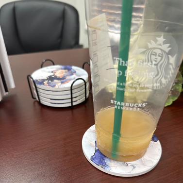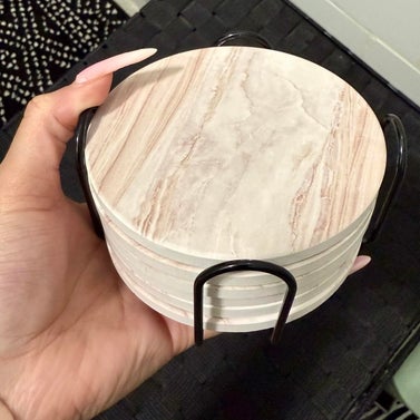 Promising review: "I have a black-and-white look for my computer desk. These ceramic coasters pop nicely off the black desk mat I purchased. It's great for hot and cold drinks, they look great, and the small wire holder helps keep the majority of them out of the way. Would suggest to others." — Robert Oszust