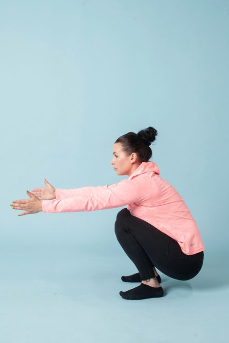 Hyvä liikkuvuus: Kyykky onnistuu jalat lantion leveydellä, varpaat eteenpäin.