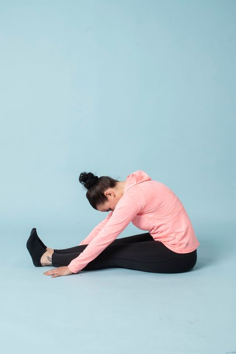Istu lattialla jalat suorina. Liu’uta kädet lattiaa pitkin eteenpäin pyöreällä selällä niin pitkälle kuin pääset.