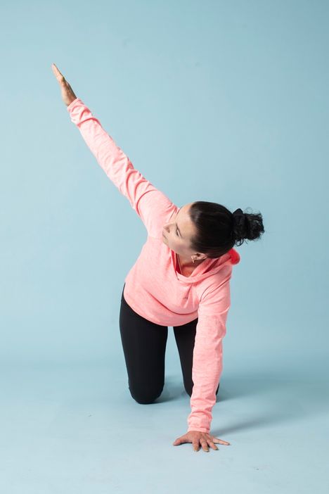 Asetu konttausasentoon. Pidä kämmenet maassa suoraan olkapäiden alla niin, että peukaloiden kärjet koskettavat toisiaan. Kierrä oikea käsi suorana sivukautta kohti taivasta, niin ylös kuin saat. Työnnä vasemmalla tukikädellä itseäsi ylöspäin. Toista liike myös toisella kädellä.