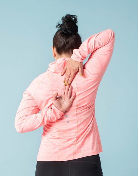 Vie kädet vuorotellen testiliikkeen tapaan selän taakse mahdollisimman lähelle toisiaan niin, että selkä pysyy suorana. Tee kahdeksan toistoa molemmille puolille kaksi kertaa joka toinen päivä.