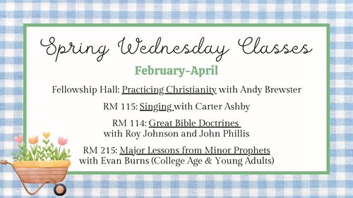 We encourage all our members to join a Bible study on Sundays at 9am and Wednesdays at 6:30pm. Signs within the building point the way towards these classes.