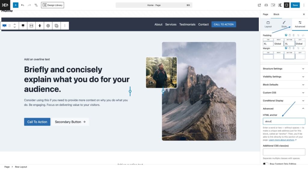 Navigate to and click on the block you want to link your navigation item to – you can link to any block. Then, go to the third tab in the block settings labeled Advanced. Scroll down to the Advanced section, and under HTML Anchor, enter the custom anchor name you created in Step 3.