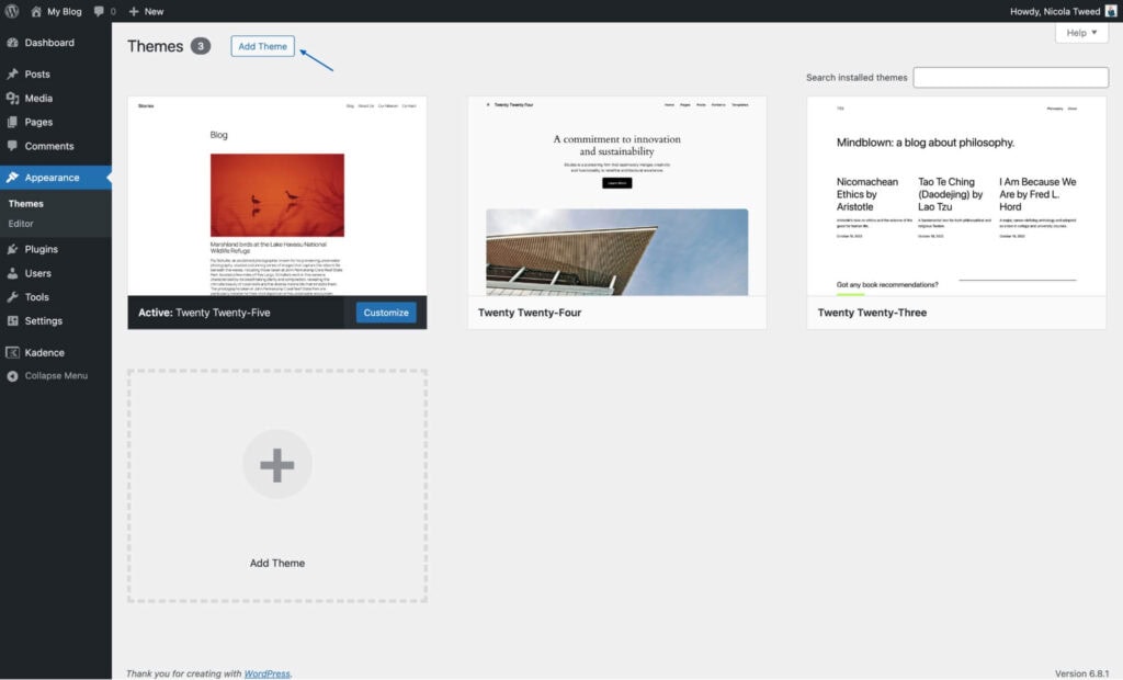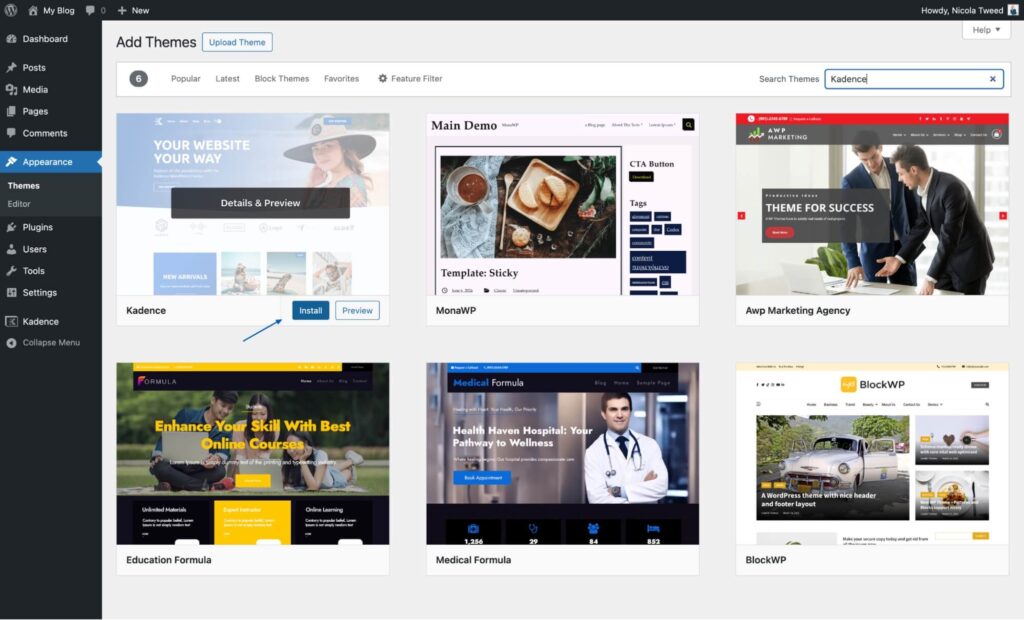 In the Search themes bar, type “Kadence”. When it appears, click Install, then click Activate to set it as your theme.