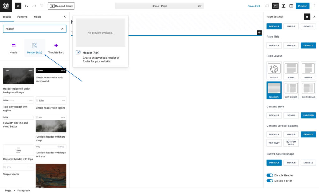 Click the “+” icon to add a new block, then search for Header (Adv) and click it to insert the block into your page