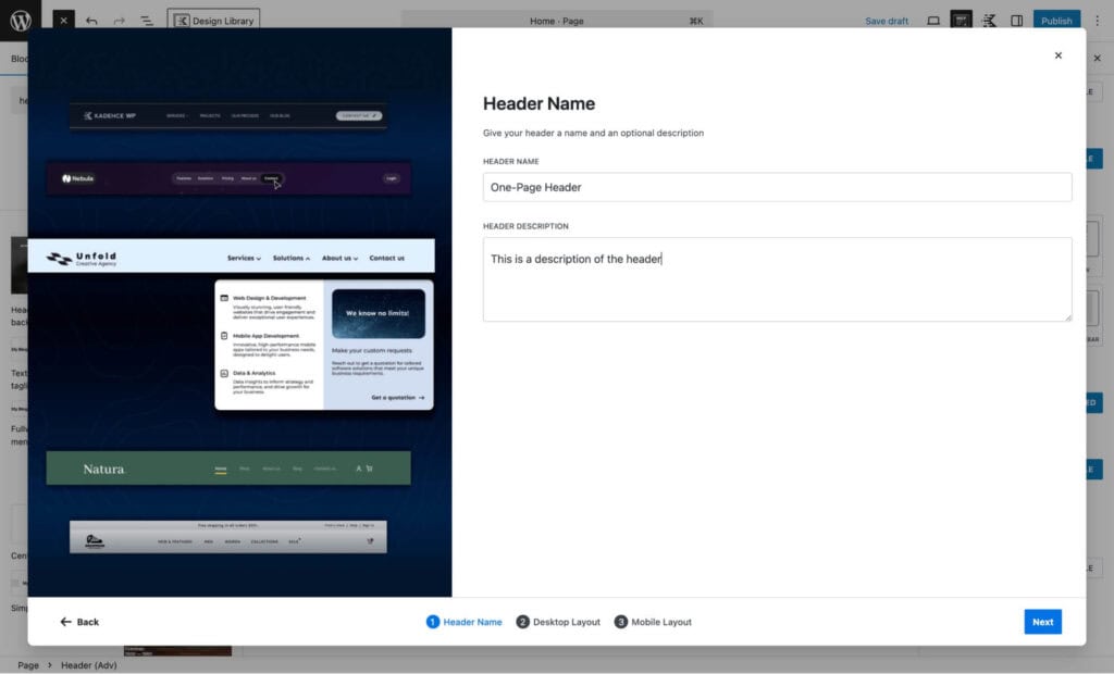 In the next step, you’ll choose your desktop header layout. You can pick from several preset options or start with a blank header if you want to build it from scratch. Once you have chosen your preferred Desktop header layout click next