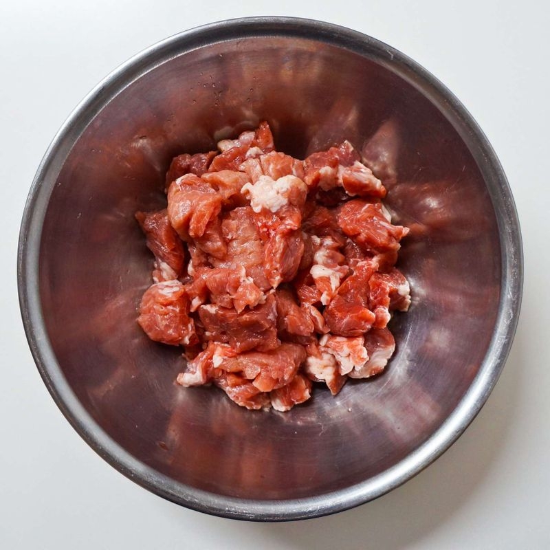 Cut the pork into bite-sized pieces and marinate with 1 tablespoon rice wine, a pinch of black pepper and a pinch of salt.