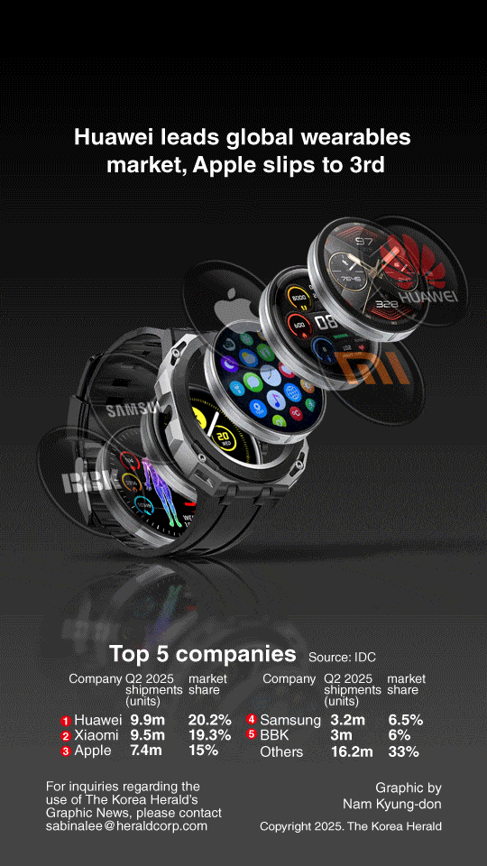 Huawei increased its shipments from 8.9 million to 9.9 million units, while Xiaomi saw a sharper rise from 5.9 million to 9.5 million, marking growth of 61 percent. Apple shipped 7.4 million Apple Watches during the quarter, up 28.8 percent from 5.7 million a year earlier.